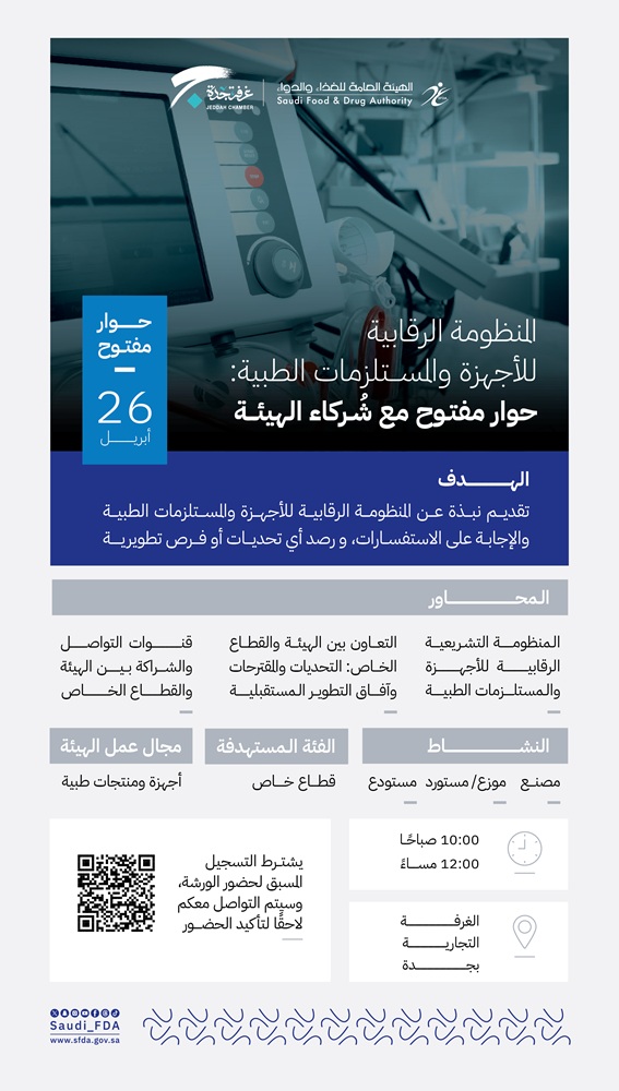 2026-04-26 - 2026-04-26 المنظومة الرقابية للأجهزة والمستلزمات الطبية: حوار مفتوح مع شُركاء الهيئة 2026-04-22 - 2026-04-22 المنظومة الرقابية للأجهزة والمستلزمات الطبية: حوار مفتوح مع شركاء الهيئة رابط التسجيل 2026-04-22 - 2026-04-22 شرح وتوضيح إجراءات الاستيراد والتصدير وحرية البيع المحاور: شرح إجراءات الاستيراد والتصدير للمنتجات الغذائية وحرية البيع. شرح وتوضيح اليات…
