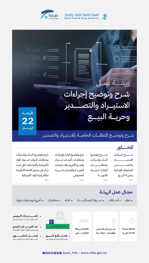 2026-04-22 - 2026-04-22 المنظومة الرقابية للأجهزة والمستلزمات الطبية: حوار مفتوح مع شركاء الهيئة رابط التسجيل 2026-04-22 - 2026-04-22 شرح وتوضيح إجراءات الاستيراد والتصدير وحرية البيع المحاور: شرح إجراءات الاستيراد والتصدير للمنتجات الغذائية وحرية البيع. شرح وتوضيح اليات…
