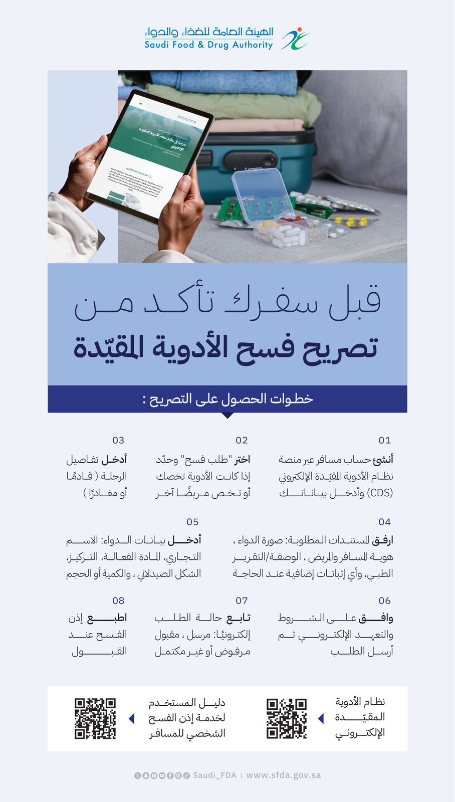 ودعت "الغذاء والدواء" إلى إبلاغ المركز الوطني للتيقظ عند حدوث أي أعراض جانبية للأدوية أو خلل في جودتها وذلك عن طريق التواصل مع الرقم الموحد: 19999، أو البريد الالكتروني npc.drug@sfda.gov.sa ، أو الرابط: https://ade.sfda.gov.sa