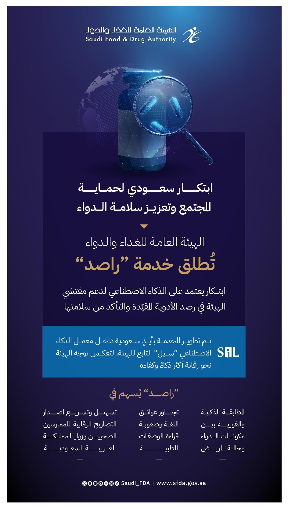 دشَّن معالي الرئيس التنفيذي للهيئة العامة للغذاء والدواء الدكتور هشام بن سعد الجضعي، خدمة "راصد" التي تعتمد على تقنيات الذكاء الاصطناعي لتنظيم وضبط دخول الأدوية المصاحبة للمسافرين، وذلك خلال فعاليات ملتقى الصحة العالمي المقام في مدينة الرياض خلال الفترة من 27 إلى 30 أكتوبر الجاري.