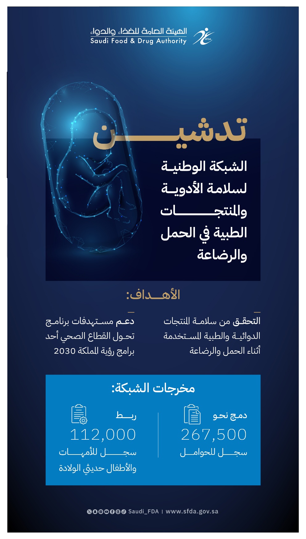 دشّن معالي رئيس الهيئة العامة للغذاء والدواء الأستاذ الدكتور هشام بن سعد الجضعي، الشبكة الوطنية لسلامة الأدوية والمنتجات الطبية في الحمل والرضاعة، ذلك على هامش مشاركة الهيئة في الملتقى الصحي العالمي المقام في الرياض خلال الفترة من 27 حتى 30 أكتوبر من العام الحالي، بمشاركة أكثر من (2000) جهة من مختلف دول العالم.