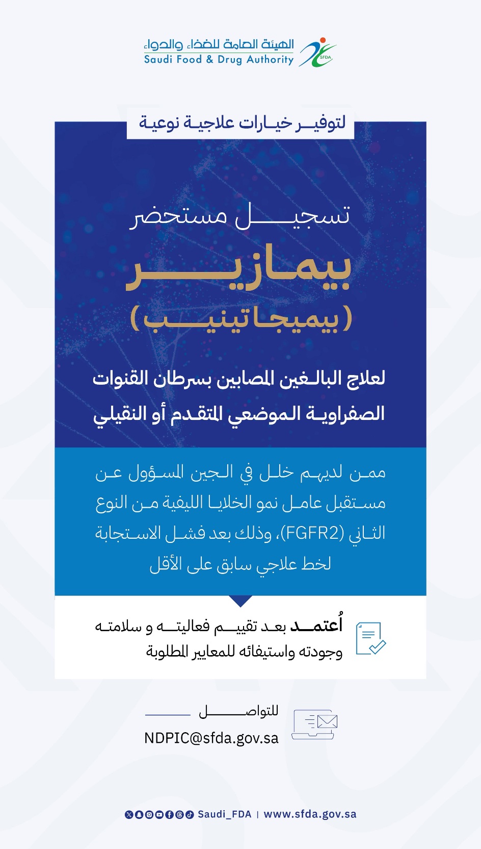 أعلنت الهيئة العامة للغذاء والدواء اعتماد مستحضر بيمازير (بيميجاتينيب) كعلاج أحادي للبالغين المصابين بسرطان القنوات الصفراوية الموضعي المتقدم أو النقيلي، ممن لديهم خلل في الجين المسؤول عن مستقبل عامل نمو الخلايا الليفية من النوع الثاني (FGFR2)، وذلك بعد فشل الاستجابة لخط علاجي سابق على الأقل.